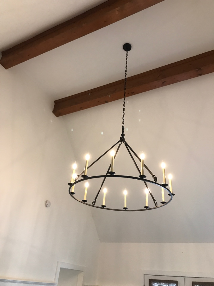 Electrician installing new light fixtures. Installed 3 pendant lights and a chandelier.