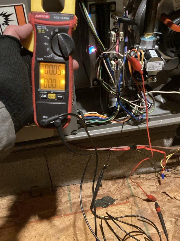 Responded to customer complaint regarding furnace (13 y/o) intermittently operating and insufficient heating performance. Conducted comprehensive system evaluation using an Amprobe ACD-14-PRO electrical clamp meter to diagnose electrical components. Testing revealed normal amperage readings across control board and wiring connections, with all safety circuits functioning properly.