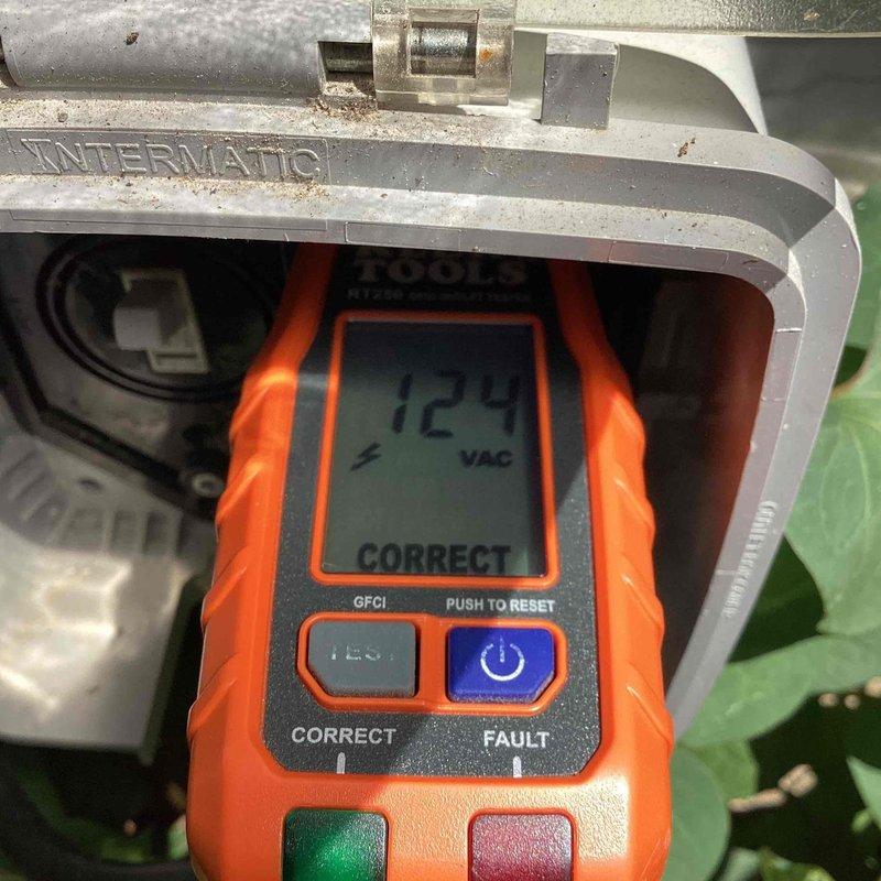 Responded to service callback for previously replaced outdoor outlets and landscape lighting reported as non-functional. Upon arrival, performed voltage testing at exterior junction box using digital outlet tester, which indicated correct 124 VAC reading at the Intermatic-brand weatherproof enclosure. Documented electrical system functionality with photos showing proper voltage present at the outdoor receptacle location.